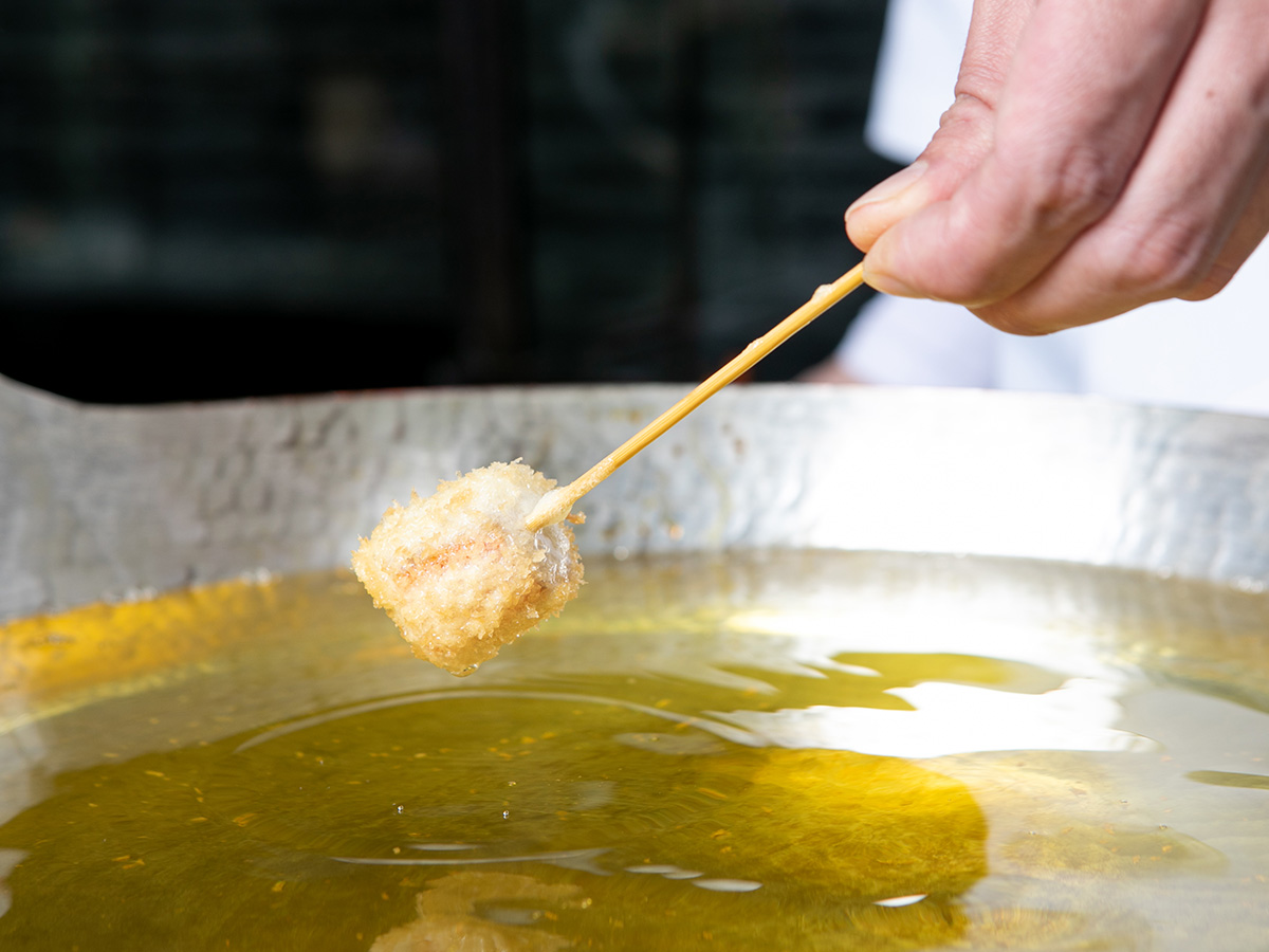 旬の野菜と新鮮な魚介を取り入れ、食材の旨みを最大限に引き出し串揚げに仕上げます。定番の具材から、なかなかお目にかかることのない高級食材まで、関西エリアの食材を中心に「生きている素材」を取り寄せています。普段串揚げで使われる事のない驚きの食材も取り入れているので、これまで味わった事のない「究極の1本」との出会いをお楽しみください。